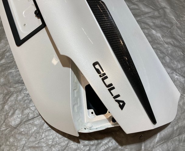 OEM trunk lid panel with factory carbon fiber spoiler, removed from a 2017–2022 Alfa Romeo Giulia Base/Ti in Trofeo White. Excellent condition, ready to install. Part #: AG004.